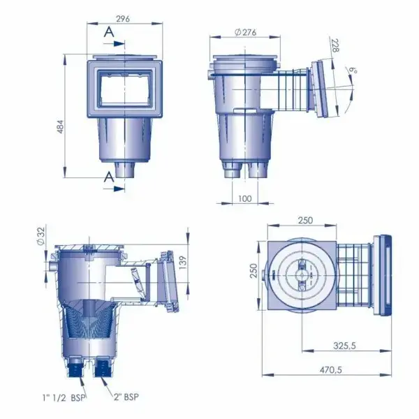 Skimmer VA, usisni 215 mm x 160 mm, za folije, s mesinganim spojevima
